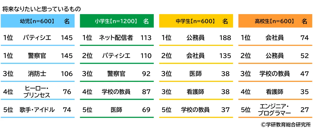 このように、幼児期は夢のある職業が多く好まれる傾向があり、小学生になるとネット配信者といった新たな職種が加わってきます。中学生から高校生にかけては、より安定した職業を希望する傾向が見られます。