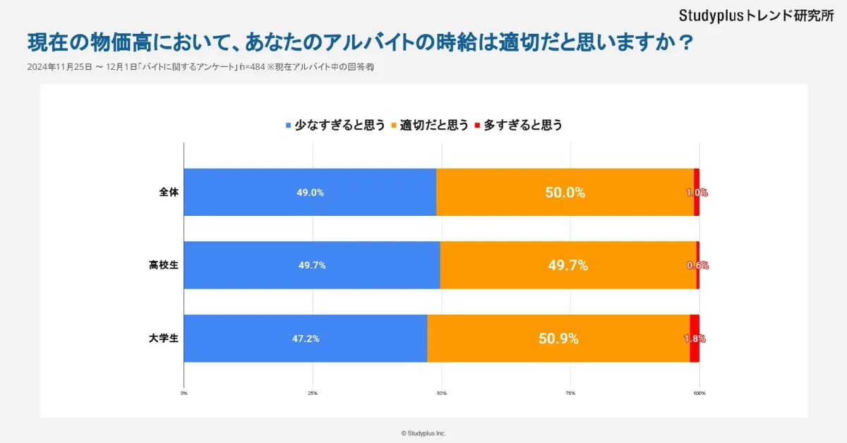 結果によれば、バイト代について「少なすぎる」と感じている学生は49.0%、一方で「適切だと思う」と答えた学生も50.0%でした。このことから、アルバイト収入に対する満足度は二分されていることがわかります。