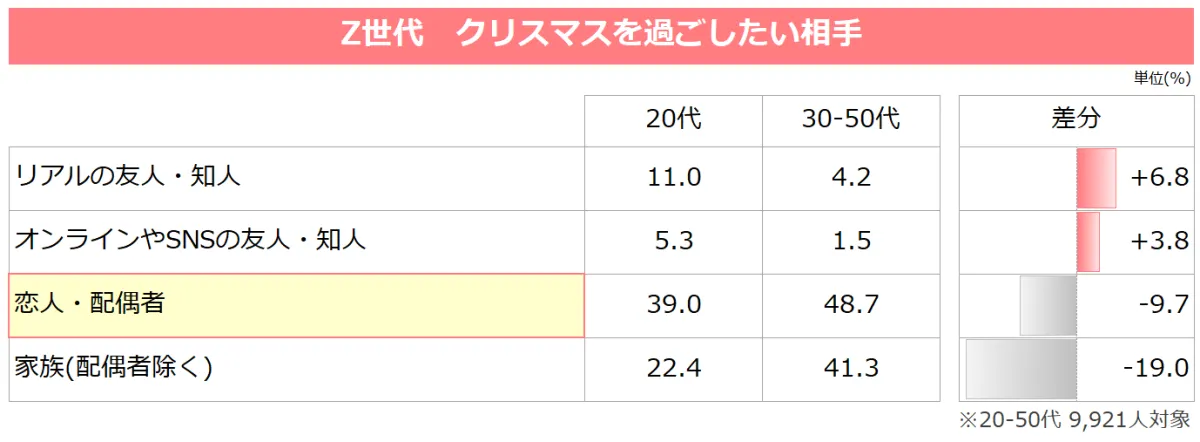 調査によると、今年のクリスマスを「誰と過ごしたいか」を尋ねた結果、Z世代のうち「恋人・配偶者」と過ごしたいと答えた人は39.0%。これは、30〜50代の約10ポイント低い数字です。その代わりに、彼らはリアルな友人やSNS上の友人との交流を選ぶことが多い傾向が見られます。このように、Z世代はクリスマスを「自分が心地よく過ごせる関係性を選ぶ日」として捉え始めています。