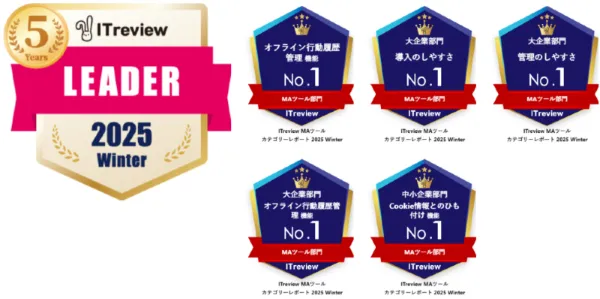 特に、大企業部門では導入のしやすさ、管理のしやすさ、オフライン行動履歴管理の3項目でNo.1を獲得。さらに中小企業部門ではCookie情報とのひも付けにおいてNo.1の評価を得るなど、全方位での実力を証明しています。