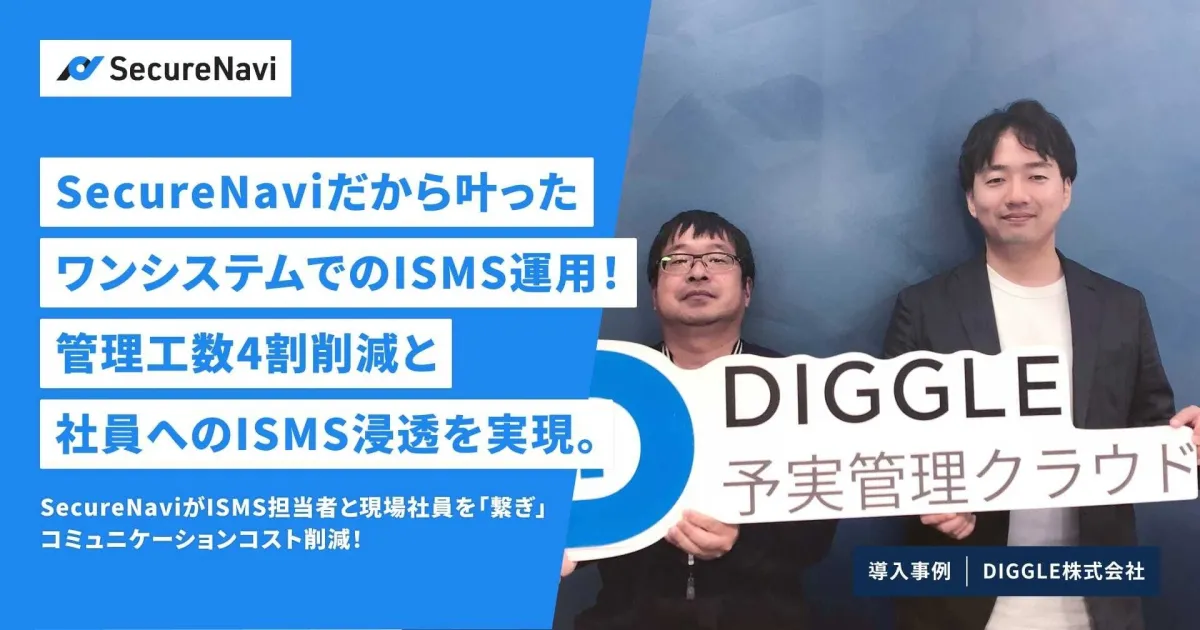 DIGGLE株式会社では、情報セキュリティマネジメントシステム(ISMS)の運用において、SecureNaviを導入し、管理工数を約40%削減しました。この導入により、社員へのISMSの浸透も実現されています。