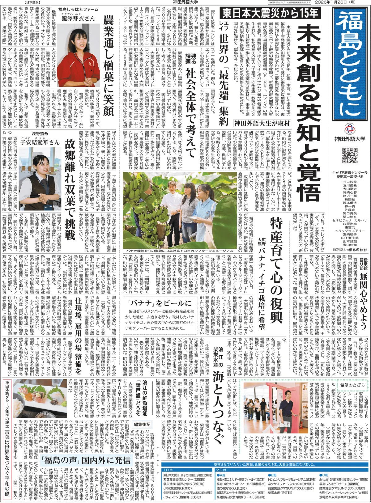 2026年2月17日、柴田真一ゼミの学生4名は、海外の大学生に向けて英語によるプレゼンテーションを実施します。彼らはフィールドワークを通じて得た知識をもとに、福島県浜通り地域の復興の歩みを文化的視点から伝える予定です。特に、日英版の震災復興新聞『福島とともに(英題:”Together with Fukushima”)』を基にして発信される内容には、地元の人々の思いも込められています。