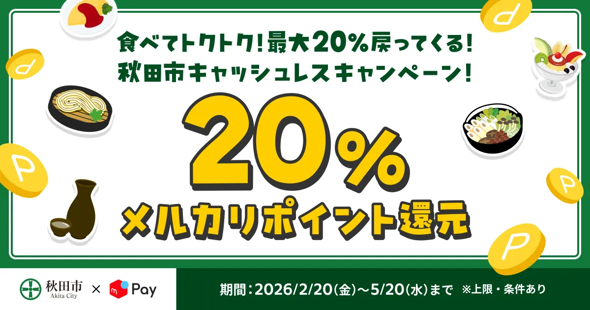 株式会社メルペイは、2026年2月20日から秋田市で「食べてトクトク!最大20%戻ってくる!秋田市キャッシュレスキャンペーン!」に参画することを発表しました。このキャンペーンでは、秋田市内の加入店でメルペイのコード決済を使用すると、お支払い金額の20%分がメルカリポイントとして還元されます。還元ポイントの上限は、1回につき2,000ポイント、期間中の合計は5,000ポイントです。