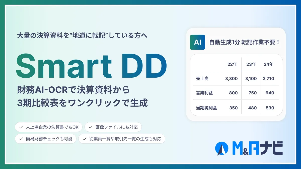 M&Aテクノロジーのリーディングカンパニー、株式会社M&Aナビが、業界に革命をもたらす新サービス「Smart DD β版」を発表しました。特に注目されているのは、このサービスが事業主や経営者にとって、財務分析作業の大幅な効率化を実現する点です。