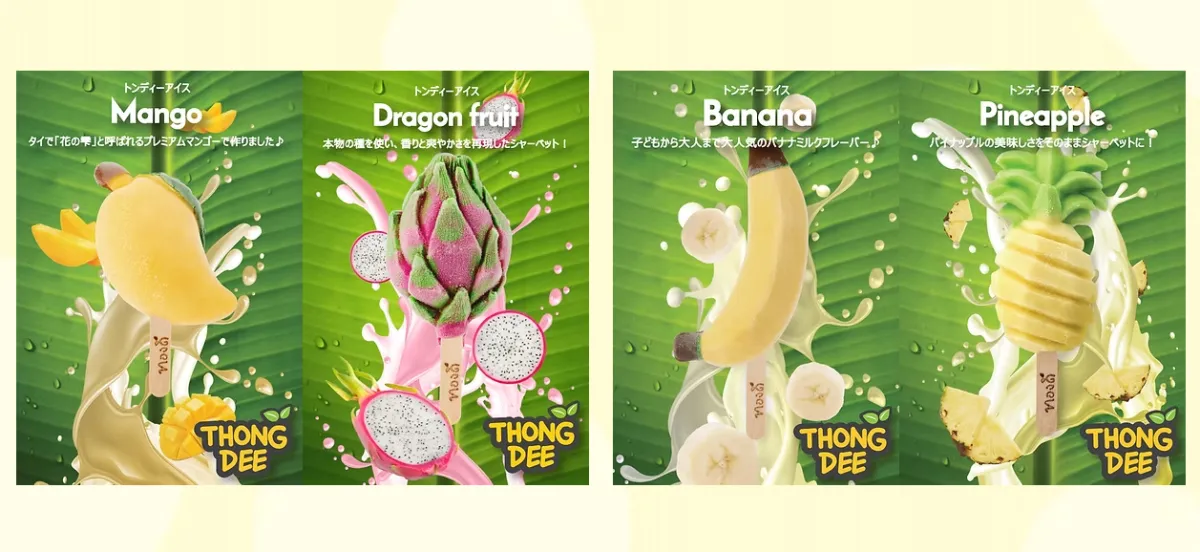 当社が新たに取り扱いを開始した「トンディーアイス」は、本場タイ直送の新鮮な無農薬フルーツを贅沢に使用した、見た目も味も楽しめるアイスバーです。これからの夏の販促やイベントにぴったりな商品として、幅広い業態での採用が期待されています。