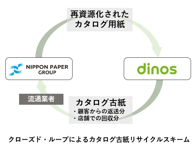 ディノスは、カタログを単なる販促ツールではなく、環境への責任を果たすための重要な資源と認識しています。2023年には、カタログ用紙を調達する日本製紙株式会社と契約を締結し、古紙の循環を促進する取り組みを行っているのです。この「クローズド・ループ」方式により、流通業者を通じて回収された古紙が再資源化され、新たなカタログ用紙として再利用されています。
