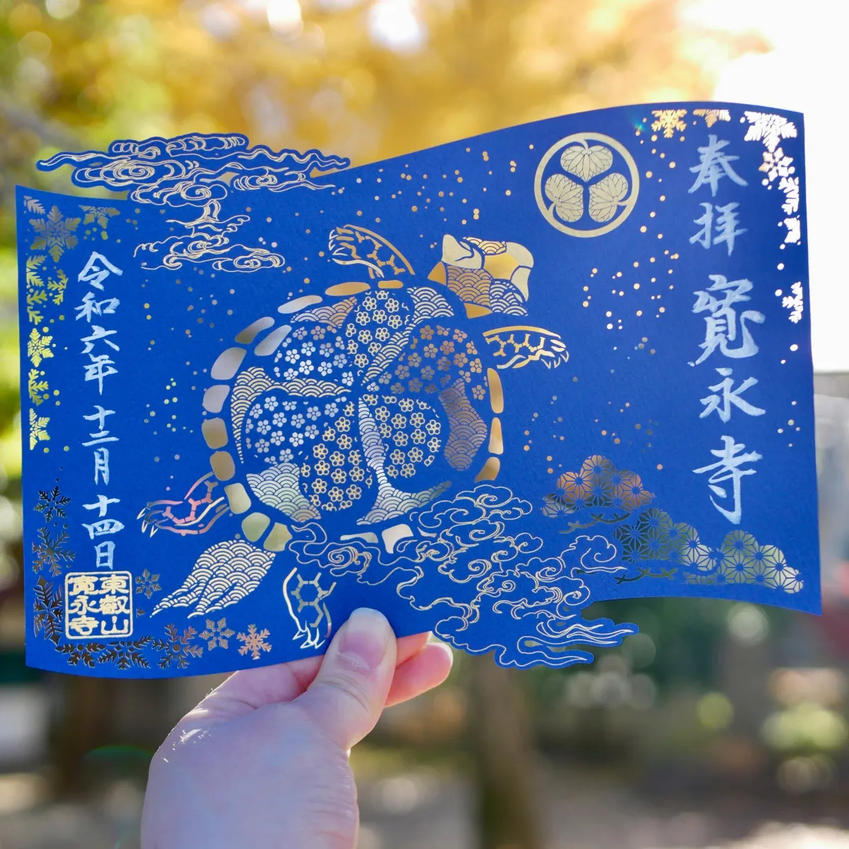 冬限定の切り絵御朱印は、寛永寺の根本中堂にある亀の置物をモチーフにしています。亀は長寿の象徴であり、寛永寺の400周年を祝う意味も込められています。この美しい切り絵は、冬の雪景色の中をほっこりと歩く亀の姿を描き出しています。
