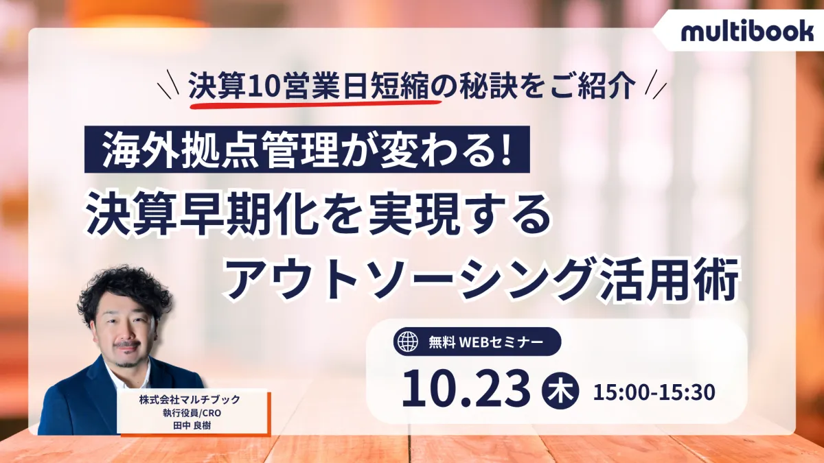 グローバルに展開する企業において、経理部門は様々な課題に直面しています。特に、海外拠点を持つ企業では、言語や制度の違い、人材確保の難しさ、処理のばらつき、担当者依存といった問題により、本社での情報集計や経営判断がスムーズにいかないケースが多々あります。こうした課題を解決する手段として「アウトソーシング」が近年注目されています。そこで、株式会社マルチブックは、10月23日(木)に「決算早期化を実現するアウトソーシング活用術」と題した無料ウェブセミナーを開催します。