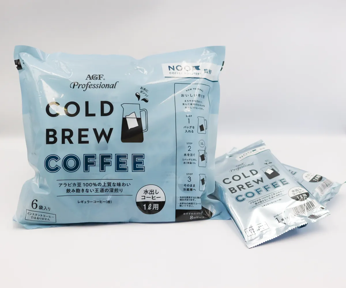 それを受けて開発されたのが、「AGFⓇプロフェッショナル」コールドブリューコーヒー1L用です。この製品は、個別包装された水出しコーヒーパックを使用するため、抽出が簡単で、風味の劣化も防げる優れものです。