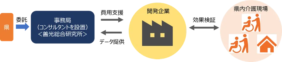 今回の事業の事務局は、株式会社善光総合研究所が受託しており、開発企業に対して改良作業における経費支援やアドバイスを行います。さらに、介護ロボットコンサルタントが現場のニーズに基づいた助言を提供し、開発企業の活動をサポートします。