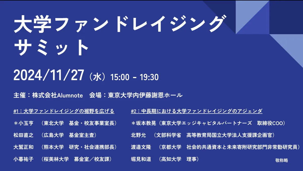 来たる11月27日、東京大学の伊藤謝恩ホールで「大学ファンドレイジングサミット」が開催されます。このサミットは、株式会社Alumnoteの主催により、産学官のさまざまなステークホルダーが一堂に会する機会です。大学経営の次のステップを探り、ファンドレイジングの可能性を議論する重要なイベントとなります。