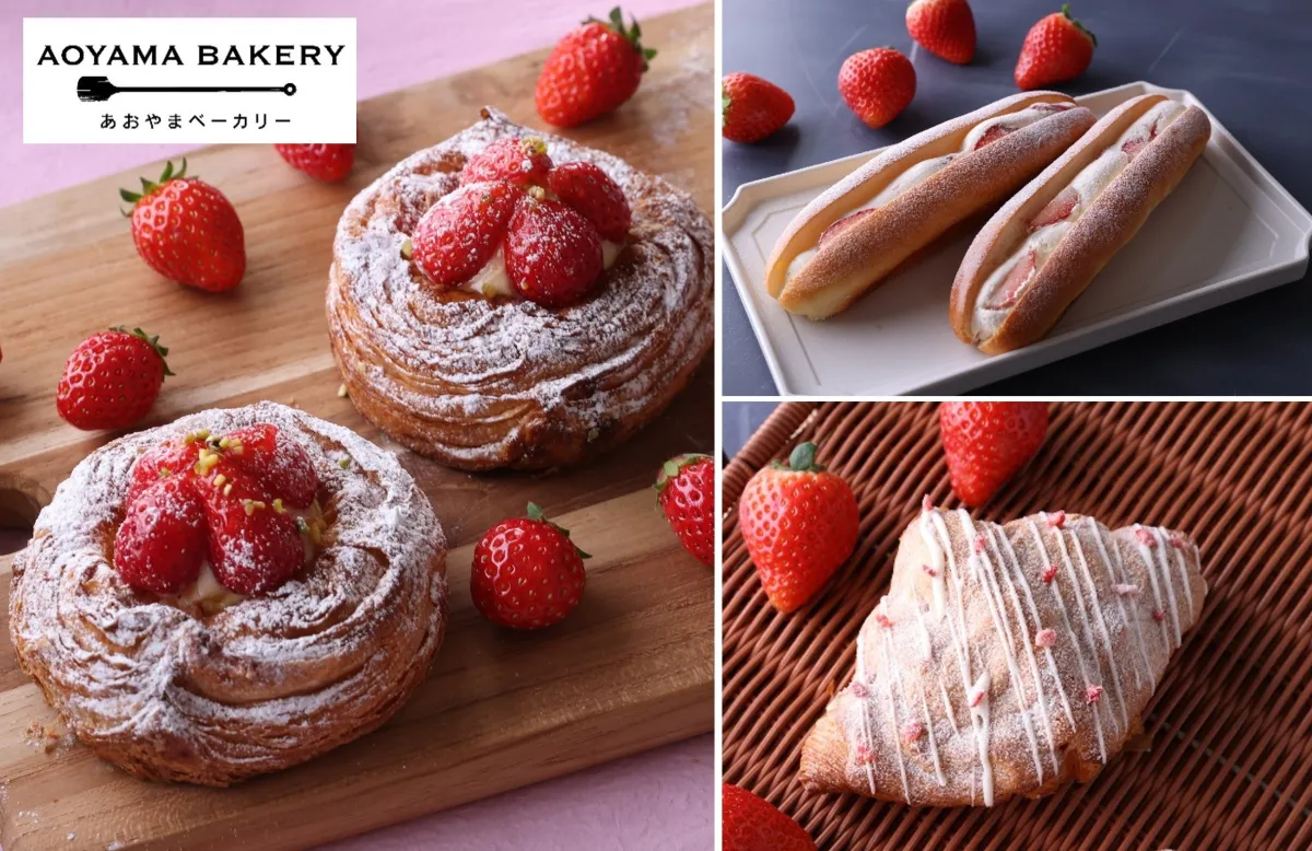あおやまベーカリーは地産地消のパンをテーマに、50種以上の焼きたてパンを提供しているお店です。今回の苺フェアでは、埼玉県春日部市の「ストロベリーファームさくら」で育った旬の苺を使い、甘酸っぱさが楽しめるパンが揃います。