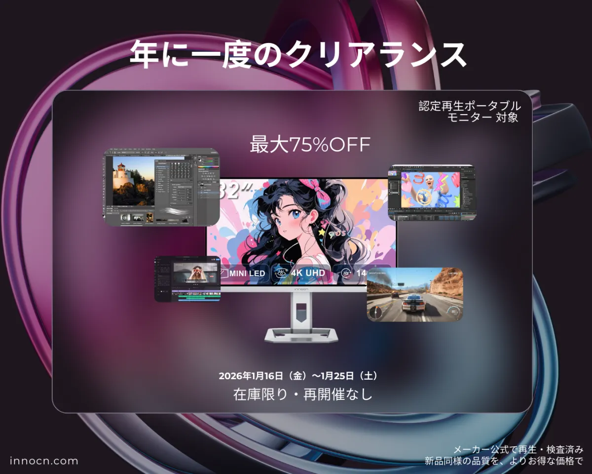 毎年恒例のINNOCNクリアランスセールが到来しました!2026年1月15日から1月25日までの期間、対象の認定再生ポータブルモニターが最大75%OFFの特別価格で手に入れるチャンスです。このセールは数量限定で行われ、売り切れ次第終了しますので、お早めにお求めください。