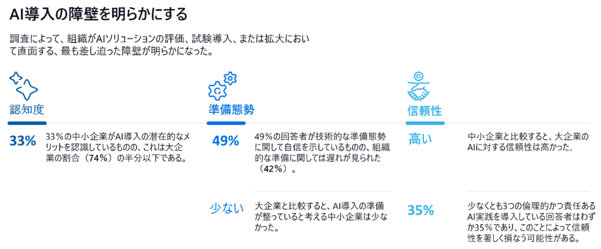 調査によると、大企業では74%がAIのメリットを強く認識しているのに対し、中小企業ではその数値が33%に留まるという結果が出ました。このように、企業規模による認識の差が導入の遅れに影響を及ぼしていることが示唆されています。