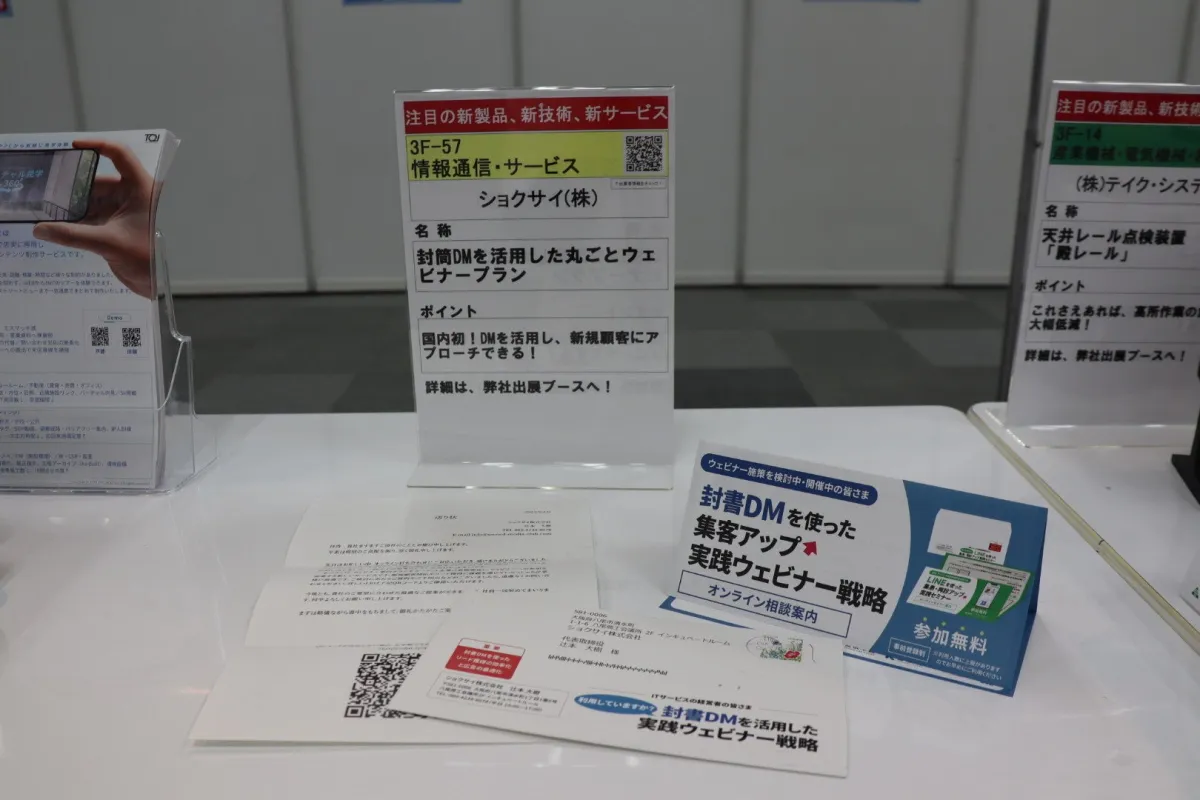 ショクサイ株式会社が展示した新製品関連の特設展示では「封書DMを活用したまるごとウェビナー サポートプラン」が紹介されました。このプランでは、封筒に入れたウェビナー案内チラシをターゲット企業に直接郵送し、参加を促す仕組みです。これにより、従来のメールマガジンリストを使用せずとも、新規顧客へのアプローチが可能となります。この新しい取り組みは、新規顧客開拓やリード獲得に苦労している企業にとって強力な武器となるでしょう。