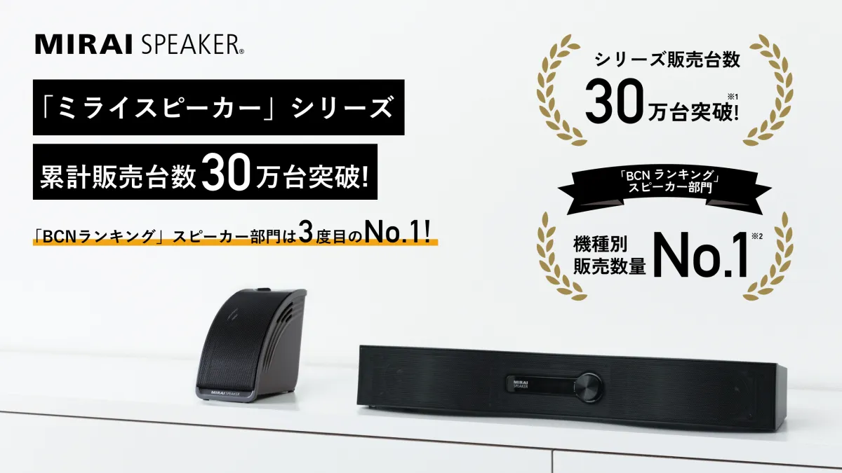 さらに、全国の家電量販店やECサイトから集められたデータをもとにした「BCNランキング」では、スピーカー部門において9月に機種別販売数量No.1を獲得。これは今年の5月、6月に続く3度目の1位獲得となり、ミライスピーカーの人気の高さを裏付けています。
