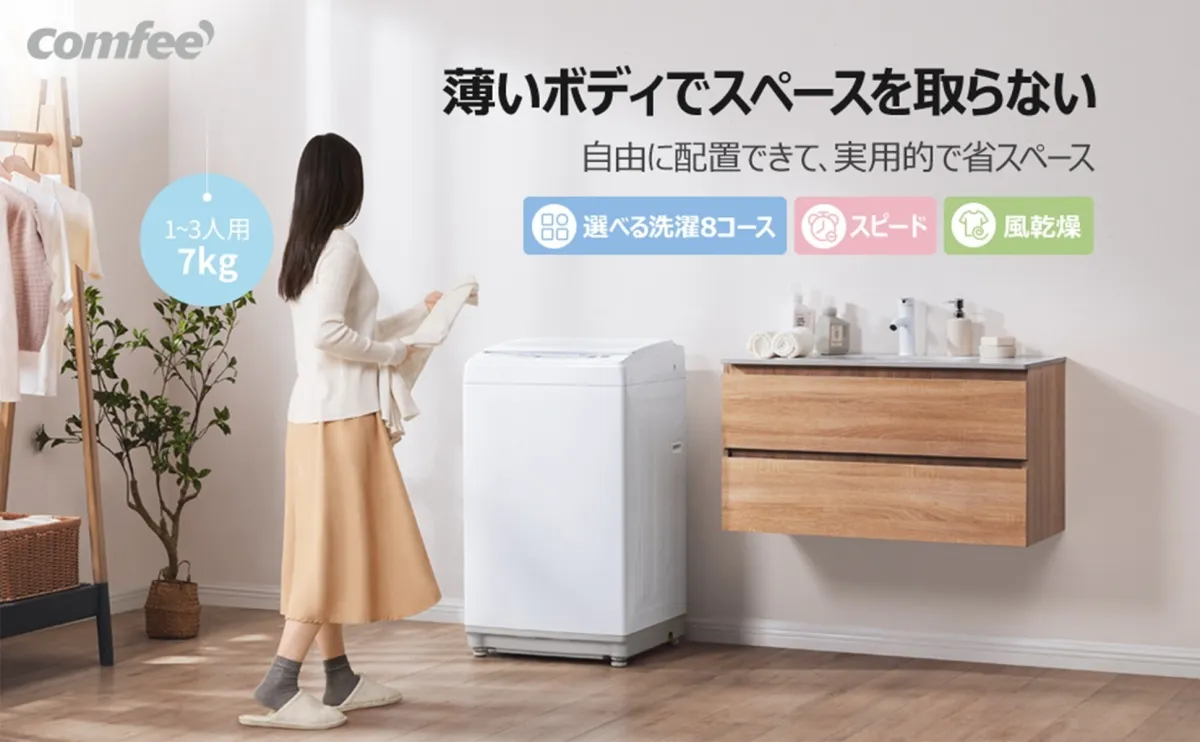 Comfeeの全自動洗濯機は、薄型ボディを採用しており、玄関やキッチンなどスペースが限られる場所でも問題なく設置可能です。そのコンパクトなサイズ感は、小さなアパートやマンションに暮らす方の強い味方となるでしょう。
