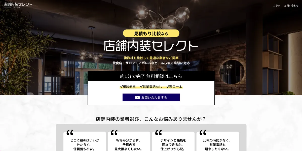 店舗内装に関する悩みを解決する最短ルートとして、『店舗内装セレクト』をぜひチェックしてみてはいかがでしょうか。