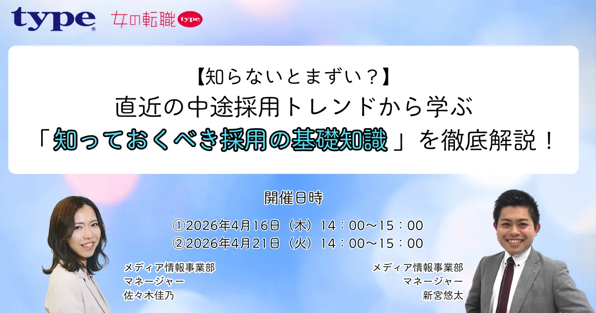 近年、労働市場の変動に伴い、中途採用が企業にとってますます重要な戦略の一環になっています。転職を希望する人材の多様性が増す中で、いかにして優れた人材を獲得できるかが企業の成長を左右します。そんな中、転職サイト「女の転職type」が開催するセミナー「直近の中途採用トレンドから学ぶ『知っておくべき採用の基礎知識』」が注目を集めています。