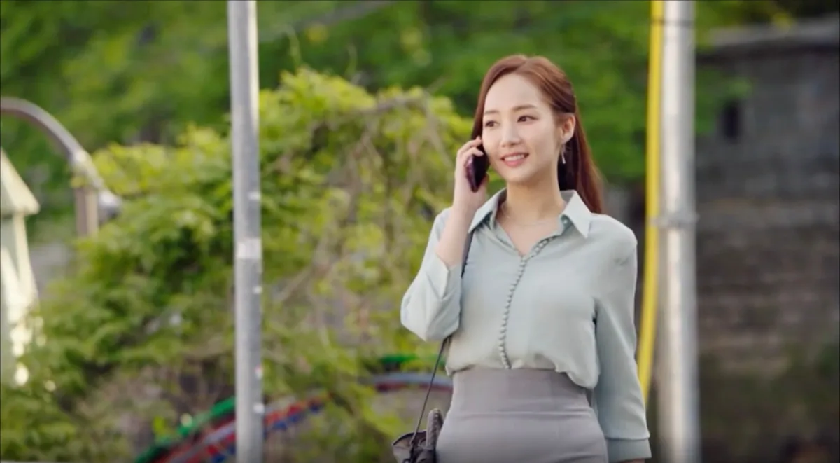 ミソのオフィスファッションは憧れのスタイルで、特に「とろみブラウスとハイウエストスカート」の組み合わせは、スタイルを美しく見せる鉄板のコーディネート。彼女の清潔感あふれる色使いや、高めのポニーテールが、この作品の中での「美貌と仕事の両立」を象徴しています。