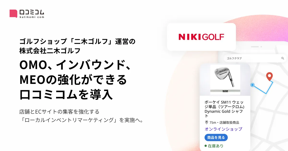 ゴルフショップ「二木ゴルフ」を運営する株式会社二木ゴルフが、OMO(Online Merges with Offline)強化を目指す新たな施策として、店舗向け集客プラットフォーム「口コミコム」を導入しました。この取り組みは実店舗と自社ECサイトへの集客強化を図るものです。