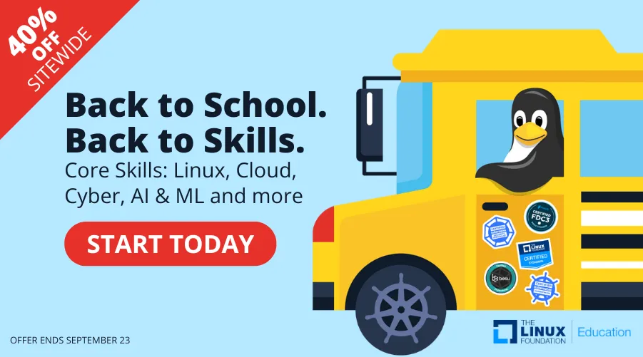 Linux Foundation Educationでは、2025年9月24日8:59AM (日本時間) までの期間限定で、豊富なIT領域のオンラインコースや認定試験、バンドルが40%オフで提供されています。この割引を利用して、最新の技術を学ぶ絶好の機会です。割引コードは「SEPT25」、購入時にこのコードを入力することでお得に受講できます。