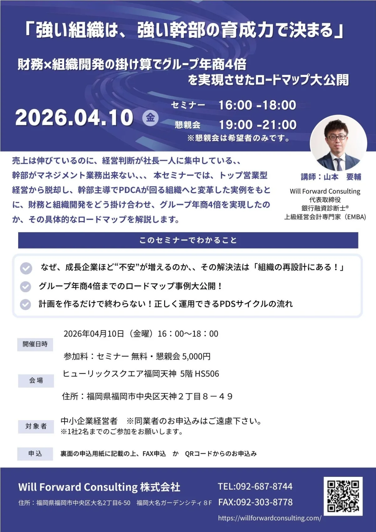 福岡市にあるWillForwardConsulting株式会社が主催したセミナーは、経営者たちにとって大変貴重な学びの場となりました。今回のセミナーのテーマは「強い組織は、強い幹部の育成力で決まる!」です。会場は福岡天神の中心地に位置し、多くの経営者が参加しました。