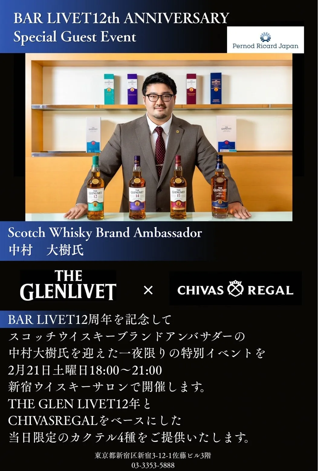 新宿のウイスキーサロンで特別な夜があなたを待っています。2026年2月21日、BAR LIVETの12周年を記念して、ペルノ・リカール・ジャパンのスコッチウイスキーブランドアンバサダー、中村大樹氏がゲストバーテンダーとして登場します。この一夜のために特別に創作されたカクテルを楽しむことができる貴重な機会です。