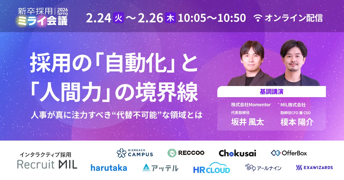 新卒採用の方式は年々進化し続けています。その中でも特に最近注目されているのが、デジタル化や自動化の進展です。2026年2月に行われる『新卒採用ミライ会議 2025 秋』において、株式会社Momentorの代表取締役である坂井風太氏が登壇し、採用の自動化と人間力の境界線について語ります。このセッションでは、AIや自動化により変わりゆく採用業務の現状について深く掘り下げていきます。