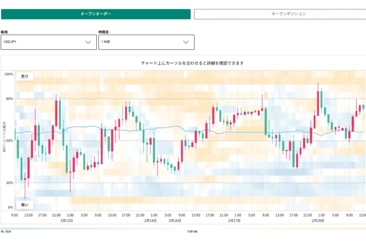 新しく導入された「過去のオーダーブック推移」は、OANDAグループが保有するグローバルな取引データを活用し、過去の未約定注文と未決済ポジションの変化を視覚的に示すものです。このチャートを利用することで、投資家は価格の変動だけでなく、その背後にある心理や需給バランスを直感的に理解することが可能となります。