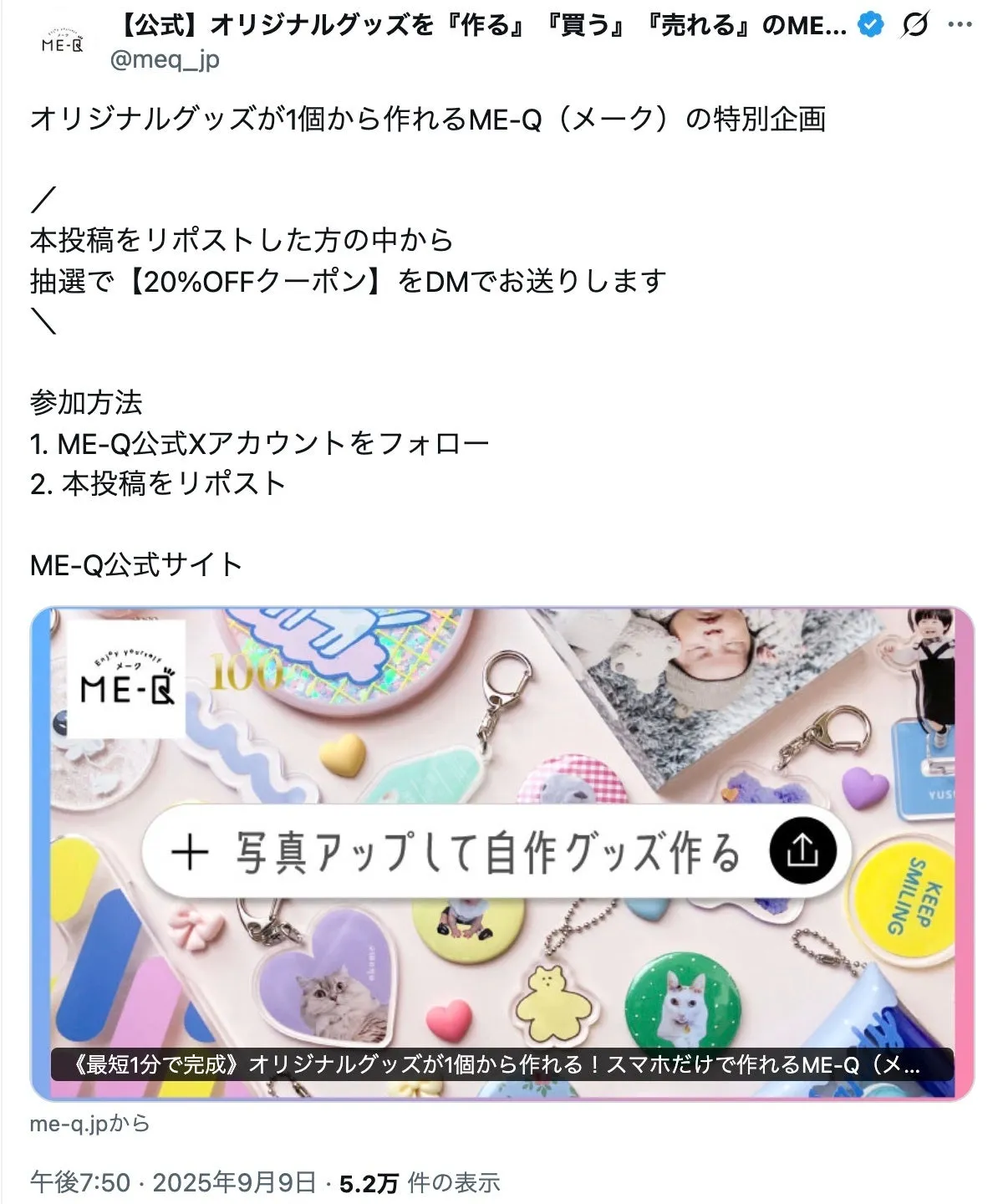 オリジナルグッズの制作を手がける「ME-Q(メーク)」が注目のキャンペーンを展開中です。これは、2025年10月31日まで、X(旧Twitter)でフォローとリポストをすることで、抽選で20%OFFクーポンを手に入れることができるというもの。詳細を見ていきましょう!