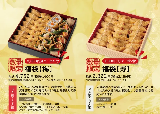 むろやが提供する2種類の福袋、「福袋【梅】」と「福袋【寿】」。それぞれの福袋には次回使えるクーポンが付いており、特に「福袋【梅】」には3,000円分、「福袋【寿】」には1,000円分が含まれています。これらはそれぞれ、定番の美味しさを味わえる内容や、一口いなりとわさび梅というシンプルに楽しめる組み合わせになっています。新年に家族や友人と集まる際の特別な一品として、これらの福袋は非常に魅力的です。