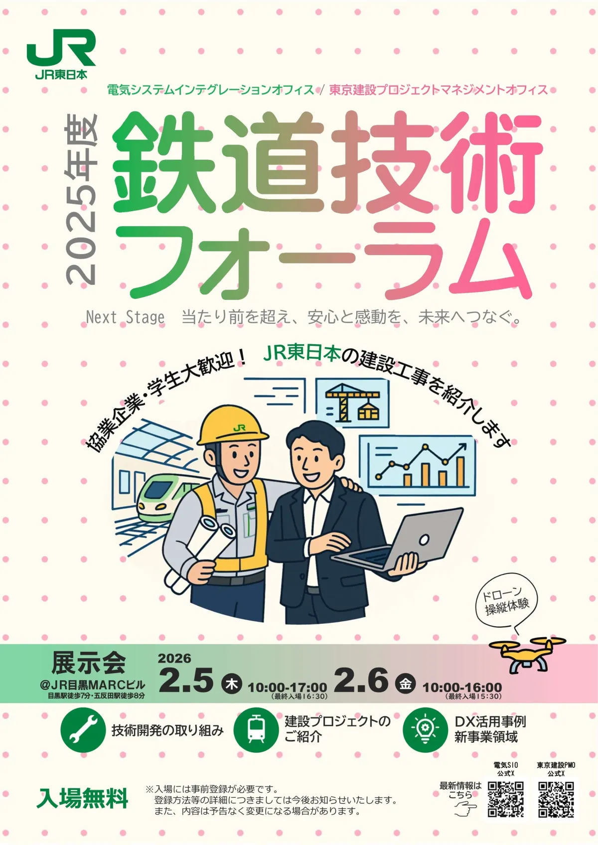 JR東日本は、34年連続となる『鉄道技術フォーラム』を2026年2月5日(木)と6日(金)の2日間、目黒のJR目黒MARCビル3階大会議室で開催します。本フォーラムは、鉄道業界における新技術やプロジェクトの発表、そして参加者同士の交流を目的とした重要なイベントです。