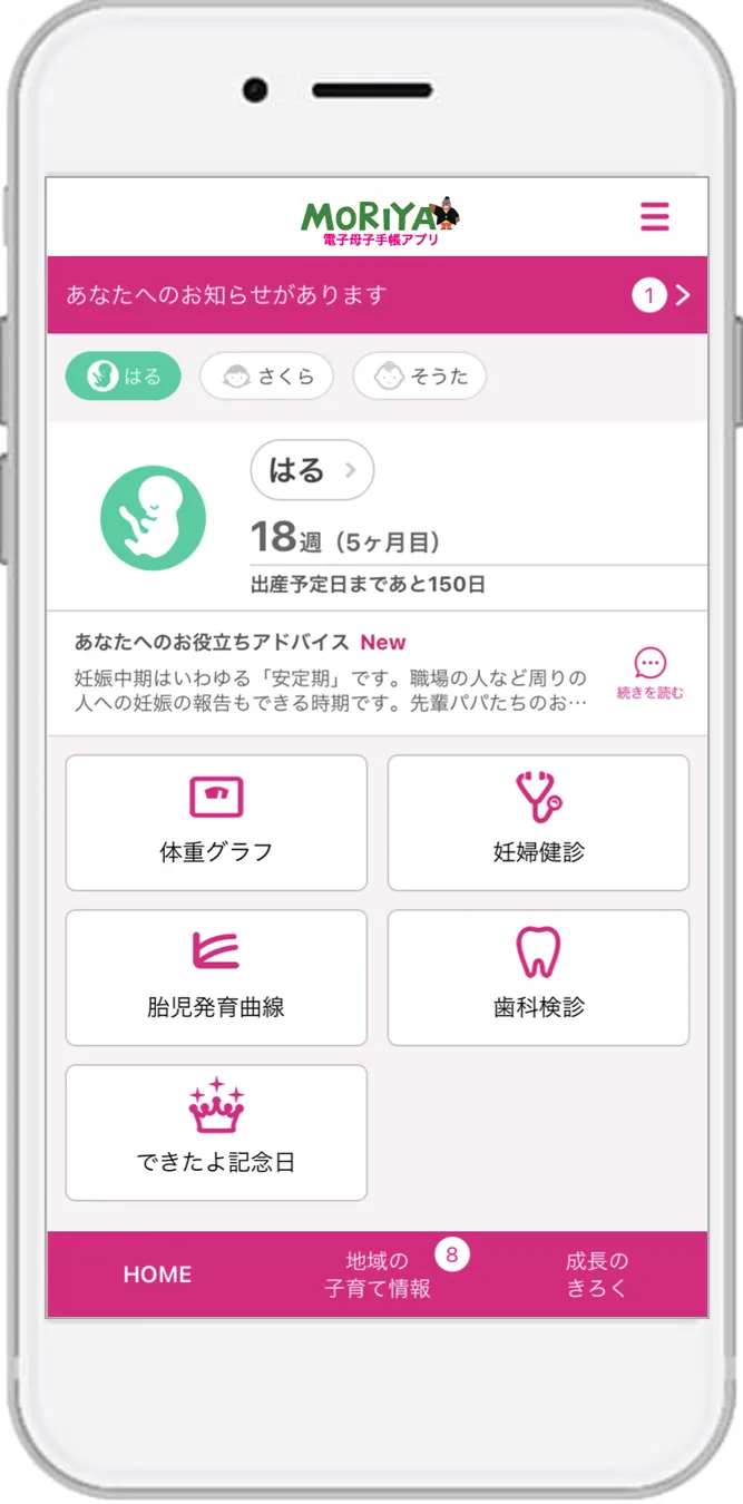 『MORIYA電子母子手帳アプリ』は、スマートフォンやタブレット、PCで利用でき、妊娠や子育てに関連する多くの機能を搭載しています。例えば、妊婦や子どもの健康データを記録し、予防接種のスケジュールを管理することができるほか、育児に関するアドバイスや地域のサービス情報を提供します。また、保護者と親族間のデータ共有が簡単にできるため、遠くに住む祖父母とも子育ての情報を共有できます。