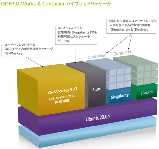 新しいG-Works 3.0は、最新のAmpereアーキテクチャに基づくGPUや、Ubuntu 20.04 LTSに対応しています。AIやHPC(高性能計算)アプリケーションに適した新機能を多数搭載しています。特に、仮想環境Dockerの他に、SingularityやSlurmなどのワークロード管理ツールも統合されています。