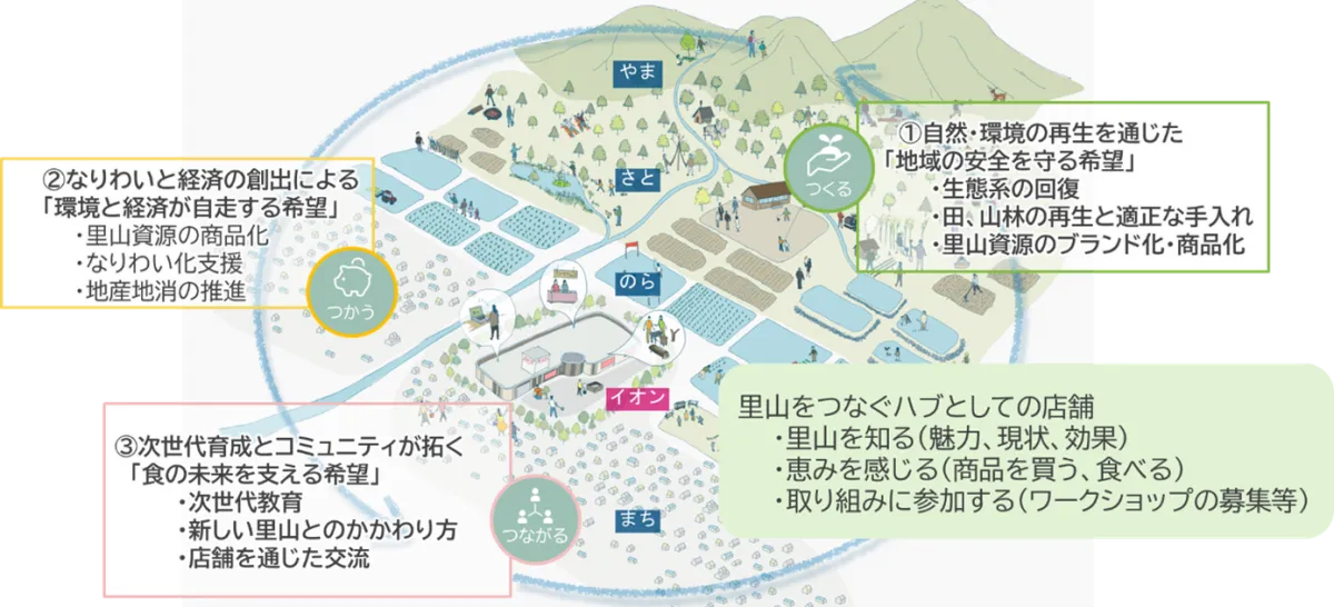 店舗が「ハブになる」: 商品販売や体験機会の提供を通じて、里山と街を繋ぐ拠点機能を果たします。