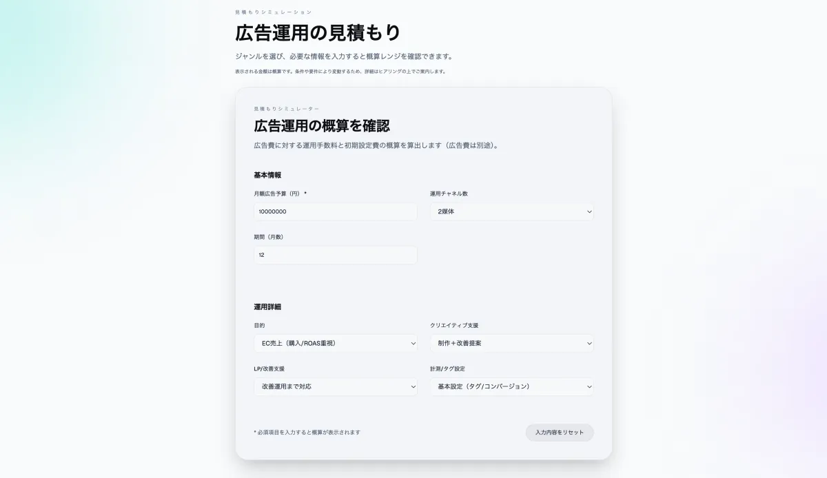 このシミュレーションツールは、広告運用を検討している企業やマーケティング担当者にとって非常に役立つものとなっています。ぜひ活用し、費用感を把握した上で最適なプランニングにお役立てほしいと思います。