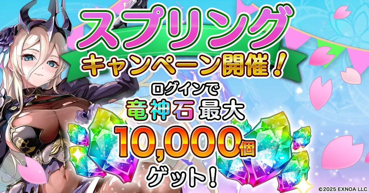 スプリングキャンペーンの目玉として、ログインボーナスが用意されています。期間中毎日ログインすることで、竜神石や冒険に役立つ強化アイテムを手に入れることができます。特に、竜神石はガチャやスタミナの回復に使える貴重なアイテムですので、毎日忘れずにログインしましょう。開催期間は2025年3月5日(水)から6月11日(水)までとなっており、長期にわたって楽しむことができます。