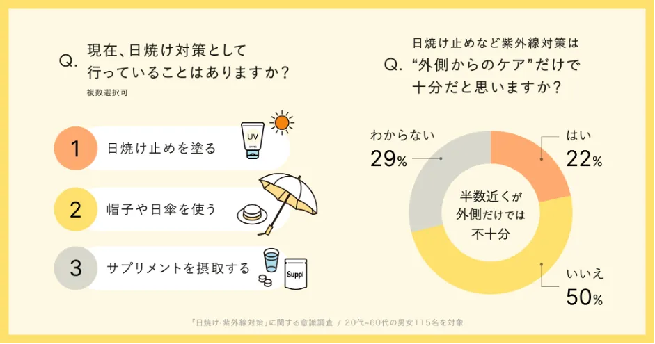 調査によれば、日焼け対策として最も多いのは「日焼け止めを塗る」(79.1%)や「帽子や日傘を使用する」(73.9%)ですが、「外側からのケアだけで紫外線対策は十分か?」という質問には49.6%が「いいえ」と回答。これは、多くの人が外部からのケアに限界を感じていることを示しています。これは、インナーケアの重要性に気づきつつある人々の意識を反映しています。