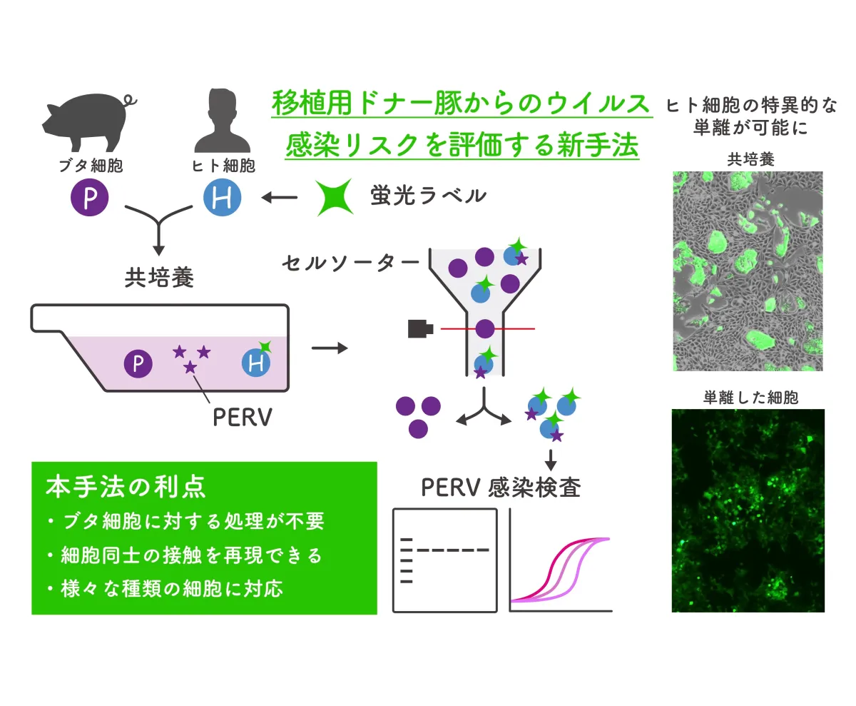 摂南大学の井上教授と明治大学の長嶋教授を中心とした研究チームは、異種移植用ドナー豚からのウイルス感染リスクを評価する新しい方法を考案しました。この方法は、従来の技術に比べて感染リスクをより正確に、また容易に評価できる点が特徴です。特に、研究チームは、ヒト細胞に蛍光ラベルを付与し、共培養を行うことで、ドナー豚の細胞とはっきり区別できるようにしました。これにより、移植時の状況に即した形で、感染リスクを分析できるようになりました。