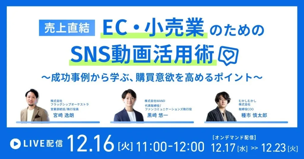 このセミナーの背景には、ECや小売業界が直面する厳しい競争があります。「動画を投稿するだけでは売上は伸びない」といった現実がある中、SNS動画を通じていかに購買意欲を喚起し、売上に結びつけるかが課題となっています。そこで、成功企業が実践するSNS動画活用術に焦点を当て、このセミナーを実施することとなりました。