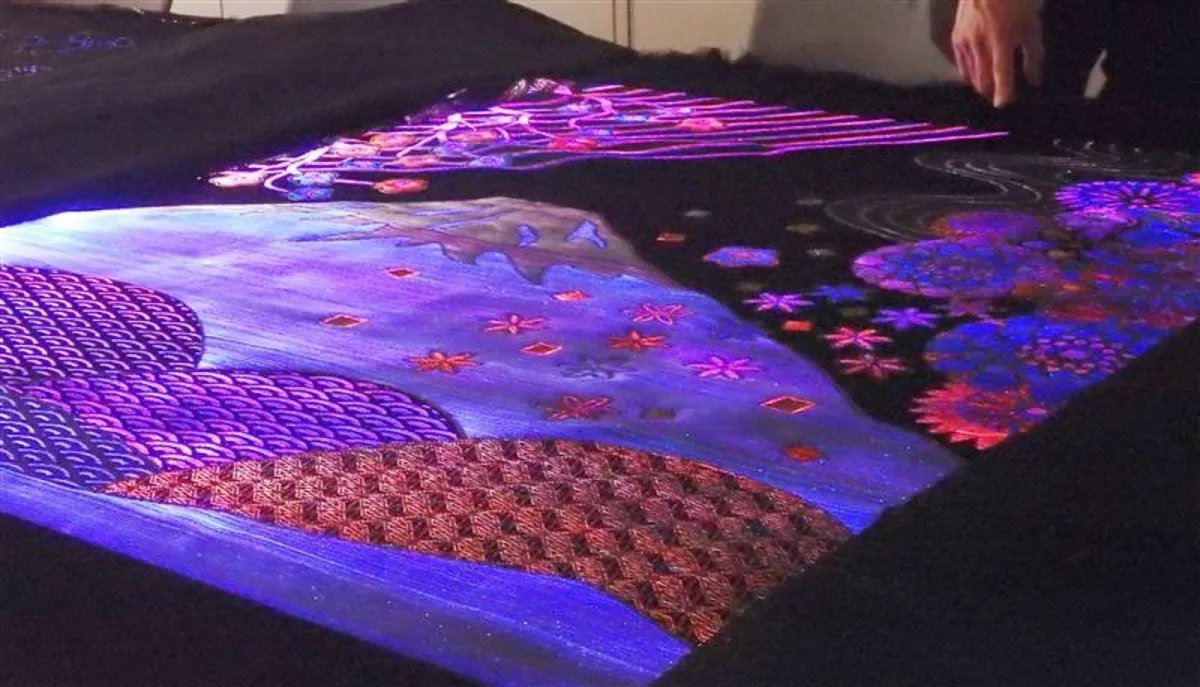 大喜が手掛ける発光ジャカード織物は、光ファイバーを使用し、光が美しく広がる特性を持っています。今回の展示作品では、神秘的な浮世絵を彷彿とさせるデザインが採用され、特に目を引くのが富士山を描いたタペストリーです。このタペストリーは、光源からの赤から青、青から緑へと変わるグラデーションが施され、見る人を幻想の世界へ誘います。
