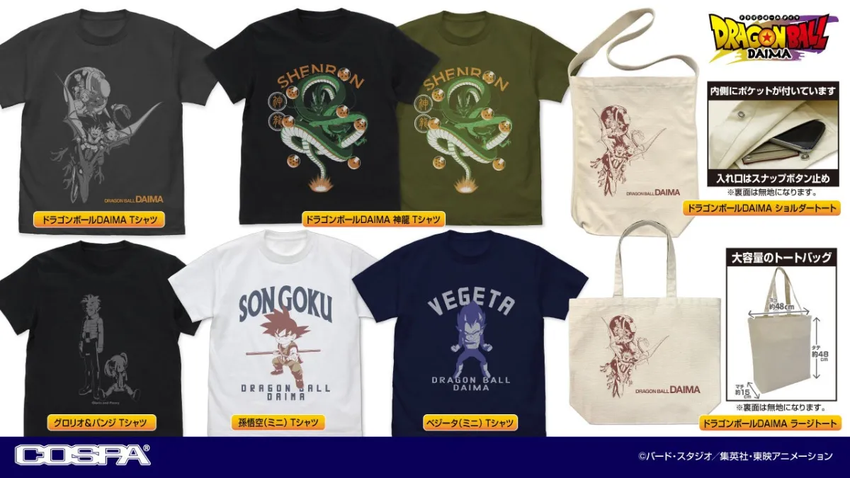 また、ドラゴンボールDAIMAシリーズのシンプルで印象的な野議のTシャツや、冒険に最適なトートバッグも新たに販売されます。