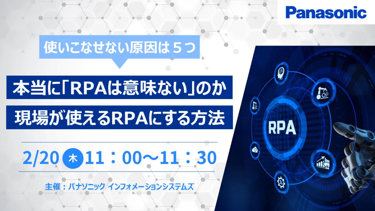 2025年2月20日(木)、オンラインで開催されるウェビナー「本当に『RPAは意味がない』のか現場が使えるRPAにする方法」に参加しませんか。このセミナーでは、RPA(ロボティック・プロセス・オートメーション)の導入を検討している方々の疑問に対して焦点を当て、大事な点をいくつか解説します。参加費は無料で、事前申し込みを行った方にのみ、参加の方法が案内されます。