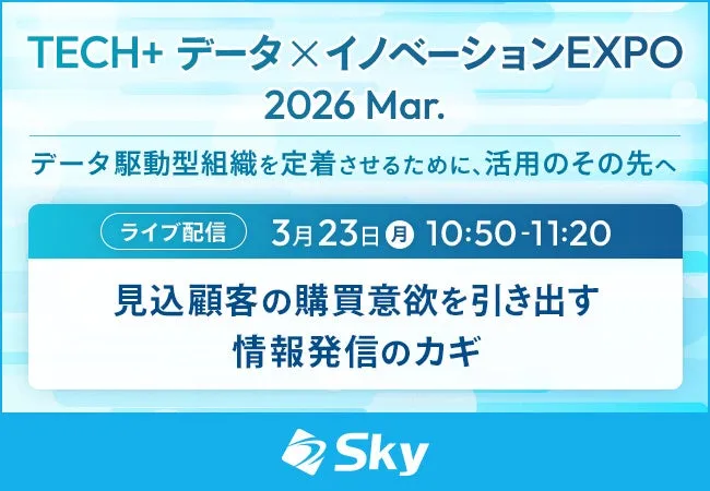 2026年3月23日から24日、最新の技術とデータ活用の知識を深めるためのWebセミナー「TECH+ データ×イノベーション EXPO 2026 Mar.」が開催されます。Sky株式会社もこのイベントに協賛し、「見込顧客の購買意欲を引き出す情報発信のカギ」と題した講演を行う予定です。