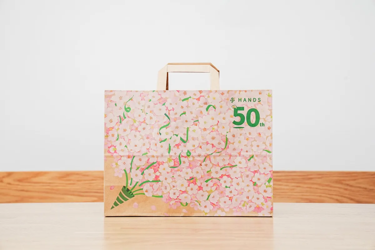 この「桜ショッパー」は、「感謝が咲く」というテーマのもとに制作されました。春の象徴である桜を全面にあしらい、50年という長い道のりを共に歩んできたお客様への感謝の気持ちを込めています。満開の桜が春の空に舞い上がっていく様子は、ハンズがこれまで受け取った数えきれない「ありがとう」の象徴でもあります。