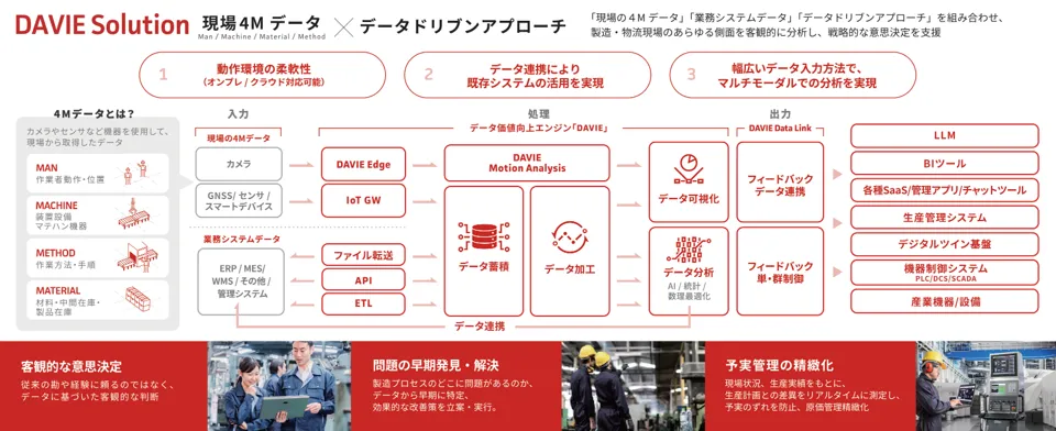 DAVIEとは、「Data Value Improvement Engine」の略で、FLTが独自開発した産業用CPS(サイバー・フィジカル・システム・エンジン)のことを指します。このシステムは、現実のデータをデジタル空間で解析し、業務の改善や意思決定をサポートします。これに基づくソリューション群が「DAVIEシリーズ」であり、大規模データの連携を目指したDAVIE Solutionや、映像解析に特化した「DAVIE MA」が含まれています。
