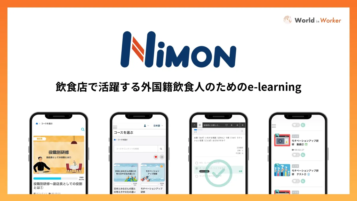 クックビズグループのワールドインワーカーは、飲食店で働く外国籍人材を支援するためのe-learningサービス「NIMON(ニモン)」を発表しました。日本の飲食業界では、多様な背景を持つ外国籍人材が活躍していますが、言語や文化の壁、教育負担が問題視されています。そんな中、「NIMON」は、外国籍人材が自信を持って働くための教育プラットフォームとして設計されました。