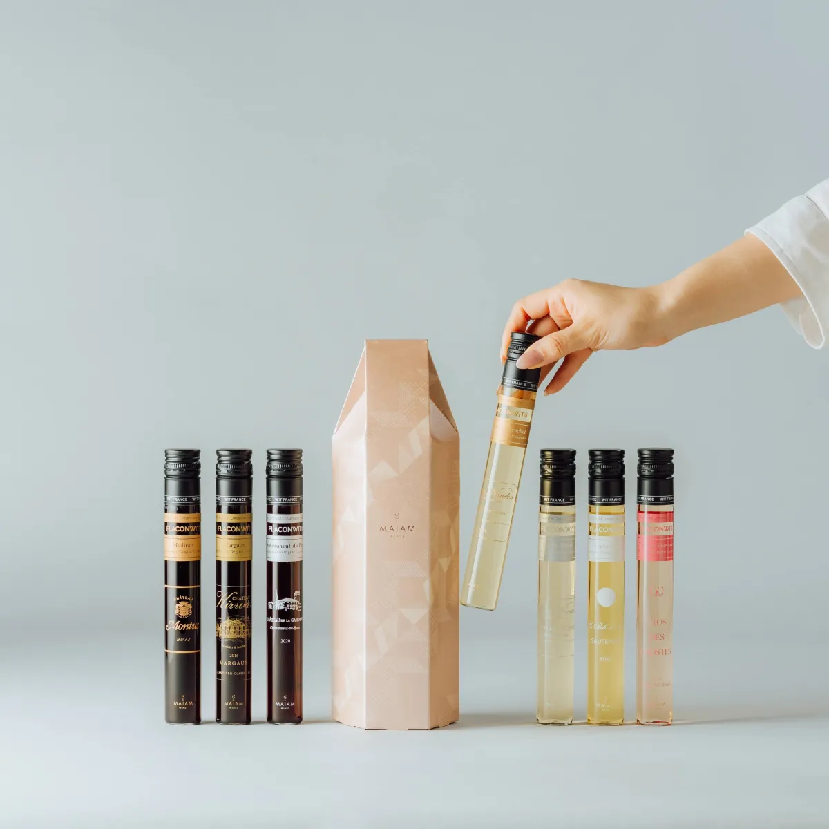 MAIAM WINESは、フランス各地から厳選されたワインを特許製法で100mlボトルに瓶詰めしている、新しい形のワインブランドです。高級ワインを気軽に楽しむことができるこのサービスは、自宅での豊かな時間を提供するとともに、贈り物としても選ばれる理由となっています。