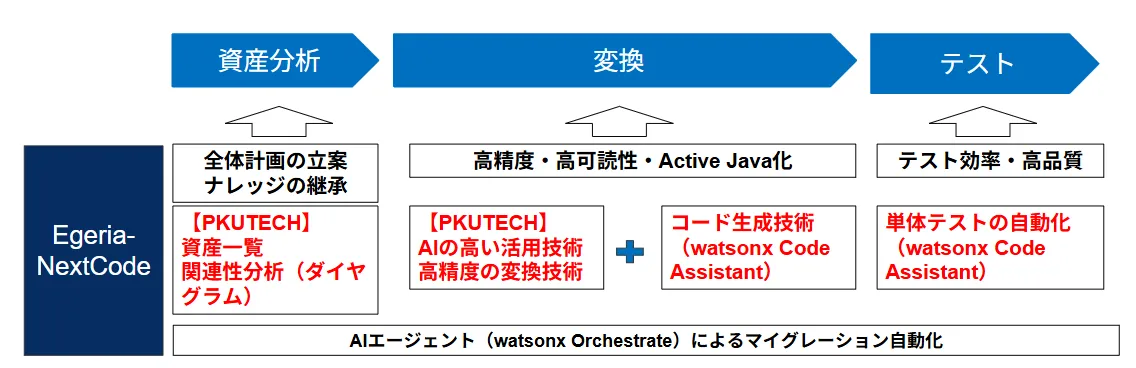 PKUTECHは、これまでにCOBOLをはじめとする資産のマイグレーションに特化しており、独自の分析ツールや変換ツールを開発してきました。今回のAIソリューション「Egeria-NextCode」は、AIインテリジェンスを活用して高精度な変換を実現します。特に「watsonx Orchestrate」を活用することで、資産分析や可視化業務の効率を高め、全体的な生産性の向上を図ります。